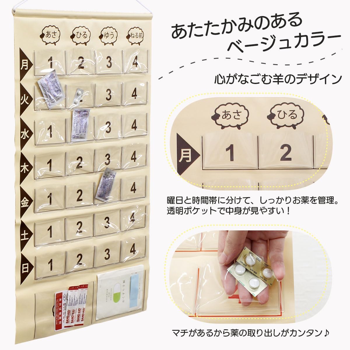 38×92cmの大型サイズのお薬カレンダーで、上部にはホワイトボードやフック、下にはポケット収納が付いています。